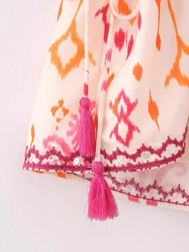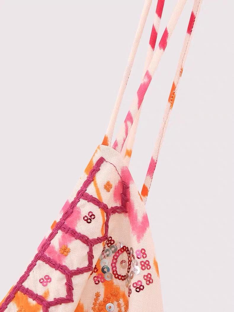 Embrace free-spirited bohemian style with this stunning embroidered babydoll cami. Featuring vibrant geometric patterns in warm peach, pink, and orange tones, this piece captures the essence of carefree summer days and festival vibes.