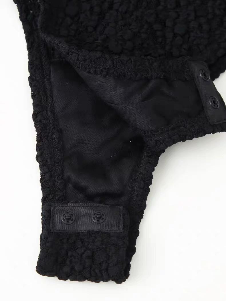 Make a statement in this sultry black lace bodysuit that combines elegance with edge. Featuring intricate floral lace throughout and a sophisticated mock neck, this piece is designed to make you feel confident and captivating.